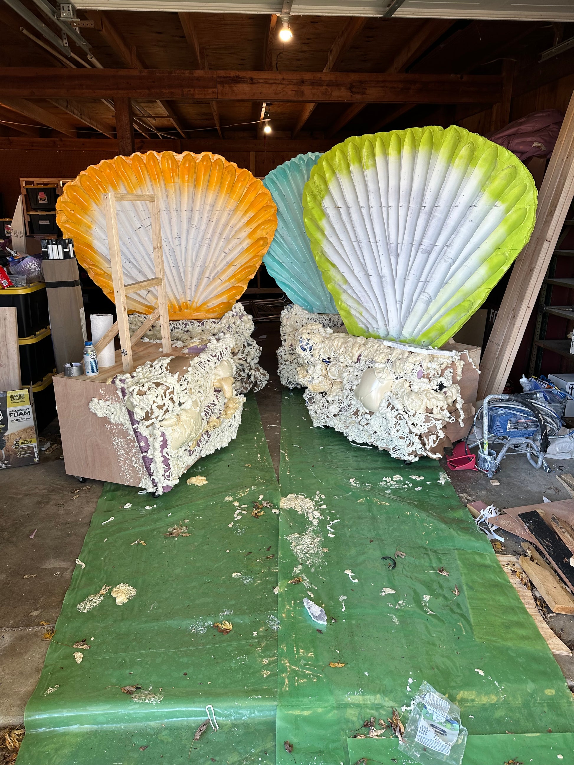 4x4’ carved foam mermaid size sea shells - painted - each. M. *** You handle shipping and ALL material costs.*** this is for labor only.. I need two weeks lead time for production. If you want rolling bases with the shells, those will be an additional $200 per shell and I need an additional build time. (These can be painted a flat black and I can apply rock texture for an additional $75 each for the bases.